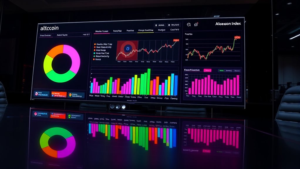 Altcoin market dominance shows how much of the total crypto market cap is held by non-Bitcoin coins, giving you insight into overall market health and investor confidence. When Bitcoin dominance drops, it often signals an upcoming altcoin season, where altcoins outperform Bitcoin. Tracking the Altseason Index helps gauge the momentum of these rallies. To better understand these trends and how they can influence your investments, keep exploring these key market indicators.