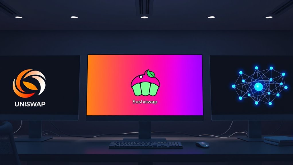 Like a knight’s armor in a medieval tale, fees vary among these platforms. Uniswap charges a flat 0.3% per liquidity pool token swap, Sushiswap is similar but sometimes offers incentives. 1inch aggregates multiple pools, so your fees may be lower, but it depends on the route chosen. You’ll pay for token swaps through gas fees and platform charges, which can fluctuate based on network congestion and liquidity pool activity.