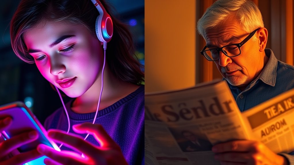 You’ll find significant regional differences in media use within generations. For example, 65% of urban Gen Zs stream content daily, compared to 45% in rural areas. These regional media patterns shape generational viewing habits, with urban youth favoring digital platforms and rural groups sticking to traditional TV. Such disparities highlight how location influences access, preferences, and the ways different regions engage with media across generations.