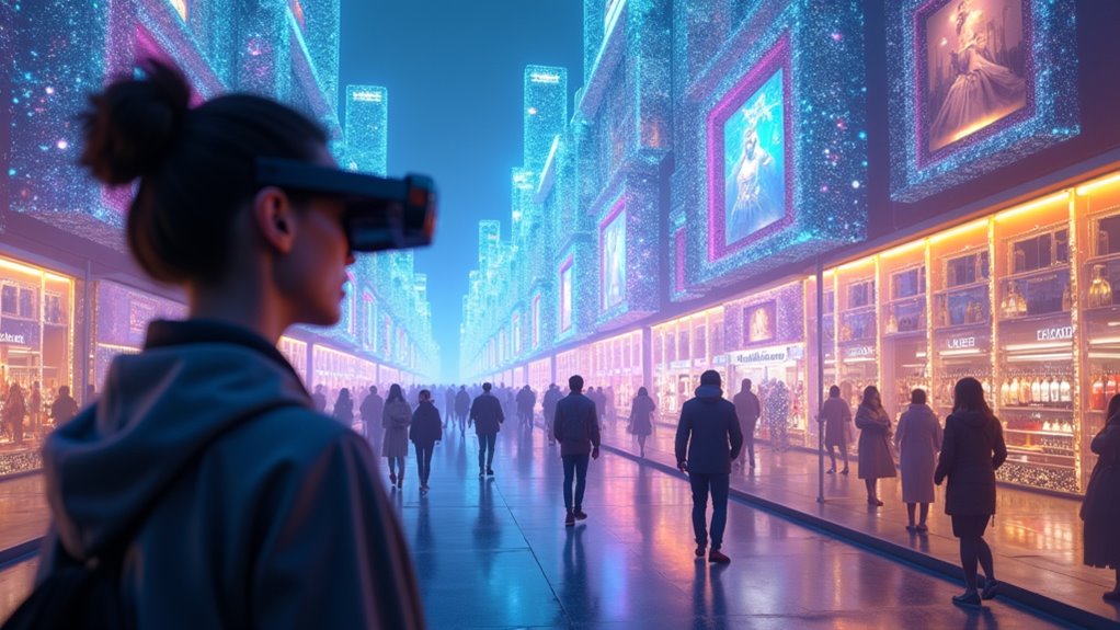 The merging of AI and the Metaverse is transforming how you shop and interact with brands online. Instead of browsing static websites, you now step into fully immersive virtual environments where you can explore products in ways that feel remarkably real. These virtual stores aren’t limited by physical space; they adapt to your preferences by customizing layouts and recommendations based on your behavior, purchase history, and personal data. As you walk through these digital spaces, AI guarantees every aspect feels tailored just for you. You can shop with friends or family avatars, making the experience social and engaging, as if you’re shopping together in a physical store. Augmented reality (AR) and virtual reality (VR) tools let you visualize products in your actual environment—seeing how furniture fits in your living room or trying on clothes virtually—boosting your confidence in making purchases. Immersive environments are enhanced by AI to provide real-time, adaptable experiences that respond seamlessly to your actions. AI-powered chatbots are available at all times to assist you in real-time, offering style suggestions or answering questions about products. This seamless interaction makes shopping more intuitive and personalized, reducing the frustration often associated with online shopping. The AI behind these systems continuously learns from your actions, fine-tuning recommendations and virtual experiences to match your evolving tastes. Dynamic marketing campaigns are also crafted through AI analysis, targeting you with offers that genuinely interest you, increasing the likelihood of making a purchase. Virtual try-ons and fitting rooms, customized to your body data, help you avoid costly returns, making shopping more efficient and satisfying. Operationally, AI plays a vital role in managing inventory and supply chains. It forecasts demand with high accuracy using real-time data from the metaverse, preventing overstock and waste. Signs of secretive behavior in consumer patterns can also be analyzed to improve customer engagement. Automated stock replenishment ensures that virtual and physical inventories stay aligned, while logistics are optimized through AI-driven adjustments responding to shopping patterns. This results in cost savings and a reduced environmental footprint. Retailers leverage these insights to adapt quickly, updating their virtual storefronts based on customer feedback and market trends, guaranteeing relevance and freshness. The integration of AI and the Metaverse opens new revenue streams through digital assets and NFTs. Virtual fashion items and limited-edition collectibles become valuable commodities, attracting a global audience excited to own exclusive digital goods that enhance their avatars. Virtual product launches and immersive events draw attention without the constraints of physical space, while blockchain technology guarantees the authenticity and ownership of these digital assets. For market research and product development, AI gathers instant feedback from virtual shoppers, enabling brands to iterate designs faster—sometimes reducing development cycles by up to 30%. Overall, AI and the Metaverse create a limitless landscape of storefronts, blending technology and imagination to redefine retail as you know it.