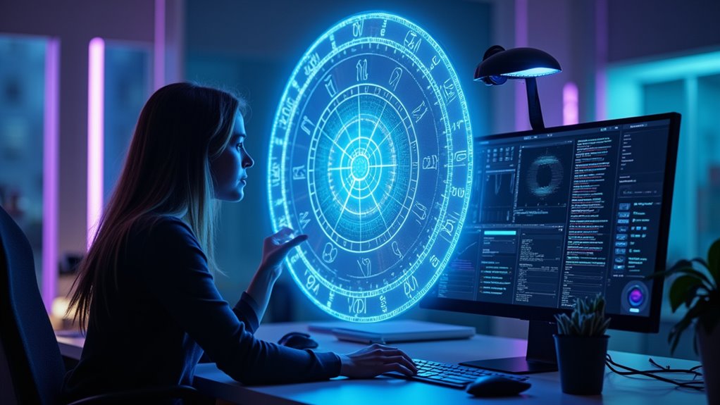 AI’s role in horoscope interpretation is expanding rapidly. Sophisticated algorithms analyze complex planetary interactions within entire birth charts, delivering more detailed and nuanced readings than traditional horoscopes. These AI systems can identify subtle patterns in astrological data, creating personalized insights that align closely with your unique profile. As a result, you’re likely to find AI-generated horoscopes more engaging and accurate, especially when they incorporate data-driven analysis, surpassing the generalities of conventional predictions. Additionally, AI tools assist professional astrologers by automating labor-intensive tasks, allowing them to focus on interpretive depth and personalized counseling. This symbiosis enhances the overall quality and relevance of horoscopic guidance you receive.