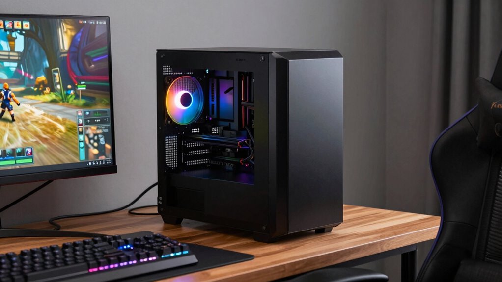 One of the standout benefits of a compact gaming PC is its portability. Unlike traditional towers that demand dedicated space and heavy lifting, these smaller units are designed to be easily transported. Whether you’re heading to a friend’s house, a gaming event, or just want a powerful machine that moves with you, a compact PC makes it simple. You can pack it into a backpack or carry-on, guaranteeing you’re not limited by bulky equipment. This portability extends your gaming options and allows you to enjoy high-quality gaming sessions virtually anywhere, without the hassle of lugging around a large desktop setup.