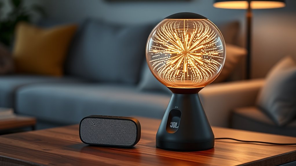 The Govee Lamp 2 Pro is a sleek, modern table lamp that features 210 embedded LEDs, allowing you to customize brightness, colors, and effects easily via an app or voice commands. It combines vibrant lighting with a built-in JBL Bluetooth speaker for high-quality sound, perfect for creating cozy or lively atmospheres. Whether for relaxing or entertaining, this versatile device seamlessly integrates into your smart home. Keep exploring to discover how it can elevate your space.