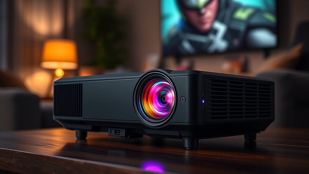 The XGIMI Horizon 20 Max is an excellent choice if you want a projector with lens shift, 5700 ISO lumens for bright images, and gaming features. Its advanced lens shift technology makes setup flexible and guarantees a perfectly aligned picture. With high brightness, vibrant 4K visuals, and low latency modes, it’s ideal for gaming, movies, and sports. Keep exploring to discover how this versatile projector can transform your entertainment space.