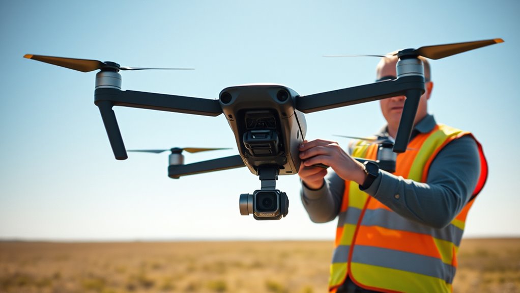 Setting up your drone for safe operation involves more than just battery care. Guarantee your drone’s firmware and software are up to date, as updates often include safety improvements and bug fixes. Calibrate the compass and IMU (Inertial Measurement Unit) as recommended, especially if you’ve traveled to a new location. Check your propellers for damage and replace any that are cracked or bent. Securely attach the camera and gimbal, ensuring they’re balanced to avoid unstable footage or crashes. Before launch, perform a pre-flight checklist: verify GPS signal strength, check weather conditions (avoid windy or rainy days), and confirm your remote control and app are functioning properly. Always fly in open areas away from people and obstacles to reduce risk.