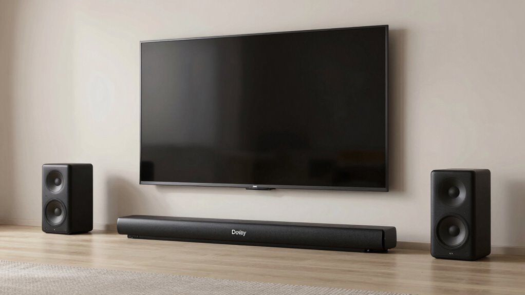 Have you ever wondered how to bring immersive, theater-like sound into your living room? Dolby Atmos soundbars are designed to do just that, transforming your space into a personal cinema. One of the key improvements these soundbars offer is their ability to create a three-dimensional audio experience. Unlike traditional soundbars, which produce sound mainly from the front, Dolby Atmos adds height channels, making it feel like sound is coming from above, around, and behind you. This effect enhances movie watching, gaming, and music listening by providing a more engaging and realistic experience. When you sit down, you’ll notice sounds like helicopters flying overhead or rain falling from above, which are delivered with incredible clarity and spatial accuracy. Wireless connectivity is also crucial, as most models now support seamless streaming from your devices via Wi-Fi, Bluetooth, or even proprietary wireless links. This means you can easily connect your smartphone, tablet, or smart home systems without cluttering your space with extra cables. Wireless connectivity not only simplifies setup but also allows you to switch between sources effortlessly. Whether you’re streaming a playlist, watching a movie from a streaming app, or playing a game, you can do it all without having to worry about tangled wires or limited connection options. Incorporating smart technology into these soundbars further enhances your entertainment experience by enabling automation and integration with other smart devices in your home. This flexibility makes your entertainment system more versatile and clutter-free, giving you more time to enjoy the immersive sound experience. Additionally, many models now incorporate smart home integration, allowing you to control your soundbar alongside other connected devices for a more cohesive setup. Advanced audio processing also plays a role in delivering precise, rich sound quality that makes the immersive experience even more compelling. Voice control is another significant upgrade that Dolby Atmos soundbars bring to the table. With voice assistants like Alexa, Google Assistant, or Siri integrated into compatible models, you can control your soundbar hands-free. Just speak your commands to turn the volume up or down, switch input sources, or even ask it to play specific movies or music. This feature adds a layer of convenience, especially when your hands are occupied or you’re relaxing on the couch. Voice control also allows for smarter integration with your smart home ecosystem, enabling you to create routines or automate your entertainment setup. An improved user experience is achieved through intuitive controls and smart features, making your entertainment setup more accessible. With just your voice, you can enhance your listening experience and make controlling your sound system effortless.