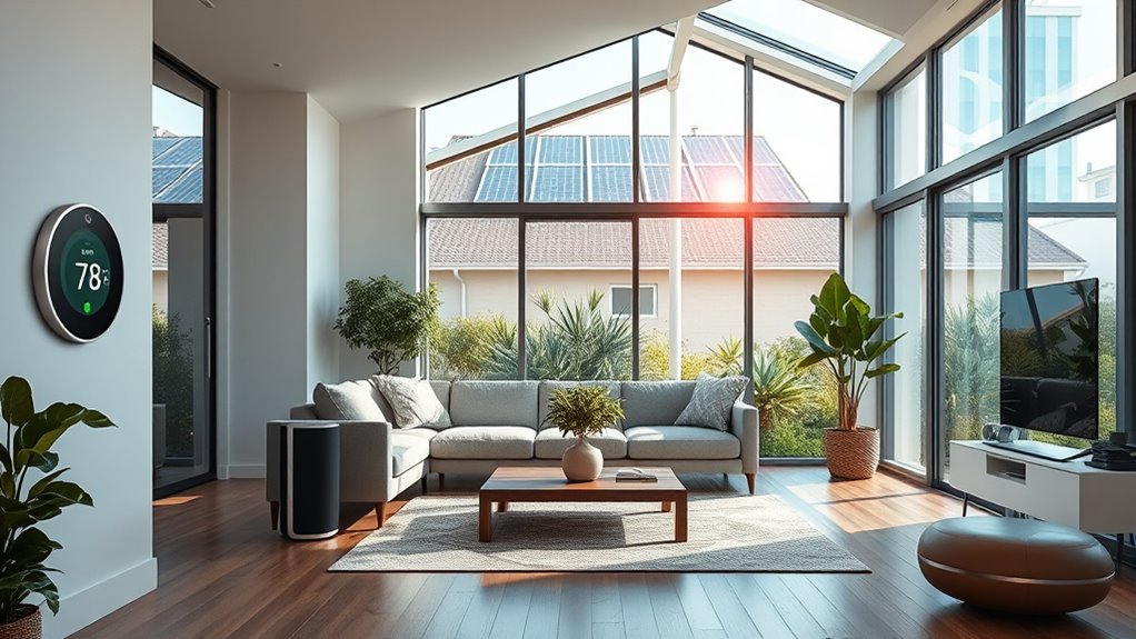 To set up a carbon-neutral smart home, start with a clear plan that integrates renewable energy sources like solar panels and smart energy management systems. Focus on improving efficiency by installing smart thermostats, energy-efficient appliances, and smart lighting. Insulate well and control devices remotely for ideal use. Combine these elements seamlessly to create an eco-friendly, sustainable home. Keep exploring to discover how these steps come together for maximum impact and effectiveness.