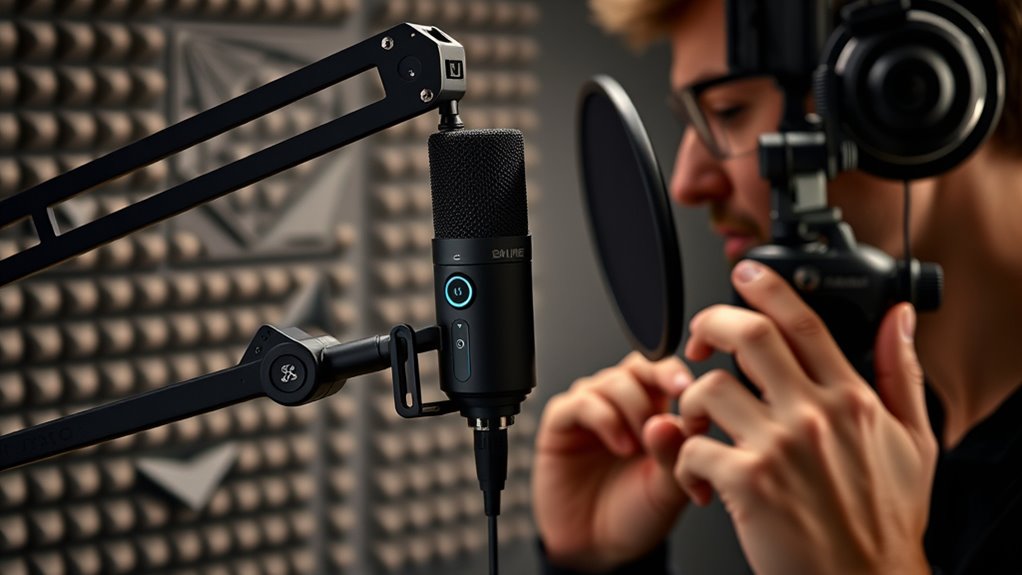 If you’re aiming for professional-quality audio, the Shure MV7I is a versatile microphone that can help you achieve just that. To get the best results, start with a solid microphone setup. Connect the MV7I to your computer or audio interface using the USB or XLR port, depending on your preferred connection. Make certain your microphone is positioned correctly—about 6 to 12 inches from your mouth—and use a pop filter if needed to minimize plosive sounds. Proper placement minimizes unwanted noise and captures your voice clearly. Once your microphone is set up, check your input levels. You want a strong signal without clipping or distortion. Adjust the gain control on the microphone or your audio interface until your voice peaks around -6 dB to -12 dB on your recording software meters. Ensuring your sound environment is well-controlled is crucial for capturing high-quality audio, as acoustics can significantly impact clarity and warmth. Next, focus on your environment. Record in a quiet, acoustically treated space to reduce echo and background noise. Use soft materials like foam panels, blankets, or curtains to absorb excess sound reflections. This will help your recordings sound cleaner and more professional. When you’re ready to record, open your preferred audio editing software. The Shure MV7I is compatible with popular programs like Audacity, Adobe Audition, or GarageBand. Before recording, do a quick test to check the audio quality, adjusting your microphone position and gain as needed. During recording, keep your microphone steady and avoid unnecessary movement to prevent shifts in audio quality. Maintain consistent distance from the mic for uniform sound levels. After recording, move on to audio editing. Use your software to trim unwanted sections, reduce noise, and apply equalization if necessary. Enhancing clarity and warmth can make your voice stand out. Normalize your audio levels to guarantee a consistent listening experience, especially if you’re editing multiple clips. Applying compression can help even out volume fluctuations and add a polished feel to your final product.