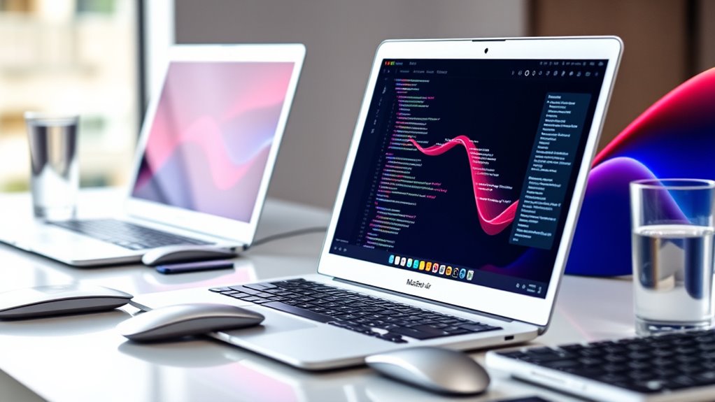 Are you making sure your MacBook Air has the right ports and connectivity options for your workflow? For power users, having sufficient ports is vital. Look for Thunderbolt 4 or USB-C ports, which support fast data transfer and external storage. If you often use multiple monitors, confirm the laptop can connect to several external displays simultaneously. A dedicated charging port like MagSafe adds flexibility and safety when powering up. Verify support for fast transfer standards such as Thunderbolt 4 or USB 4 to handle large 2TB files efficiently. Additionally, check for an audio jack and other connectivity options that enhance versatility. These features guarantee your MacBook Air adapts seamlessly to demanding tasks, making your workflow smooth and efficient.