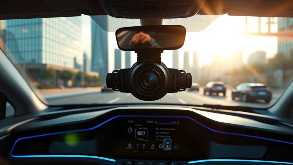Ever wonder how clear your dash cam footage will be in low-light conditions? High-resolution options like 2K or 4K guarantee sharp images that capture license plates and fine details from afar. Night vision features, including infrared LEDs and WDR technology, dramatically improve darkness recording, producing brighter, more detailed images. Large aperture lenses, such as f/1.8 or bigger, let in more light, boosting clarity during nighttime drives. Infrared night vision allows recording in total darkness—usually in black and white—while some models offer full-color night vision with smart IR switching. Multiple sensors and sophisticated image processing algorithms work together to reduce noise and enhance clarity in low-light environments. These features ensure your footage remains reliable, clear, and detailed, no matter the lighting conditions.
