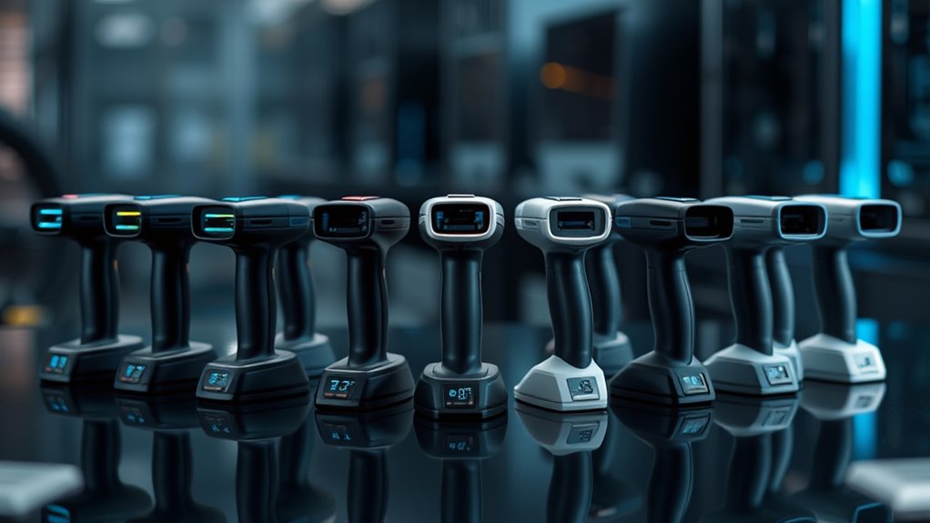 The scanning range of a 3D scanner directly impacts its ability to capture objects of different sizes effectively. It determines the maximum size of objects that can be scanned in a single pass, ranging from just a few centimeters to several meters. When choosing a scanner, I consider whether its minimum and maximum range match my typical project sizes to guarantee efficient data capture. Some scanners offer adjustable or flexible ranges, making them versatile for both small, detailed parts and large structures. The capture area, usually specified in width and height, influences how much of an object I can scan at once without repositioning. For larger objects, I look for scanners with broad ranges or that support stitching multiple scans seamlessly to produce complete, high-quality models.