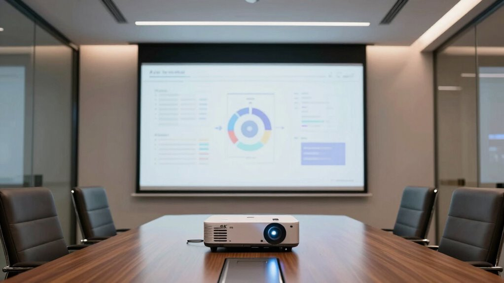 When selecting a 4K projector for high-end presentations, I focus on key factors like resolution and clarity to guarantee sharp images, as well as brightness and contrast for visibility in different lighting. Connectivity options matter too, so I can easily connect my devices, while color accuracy ensures vibrant, true-to-life visuals. Finally, I consider portability and setup to match the venue and ease of use.