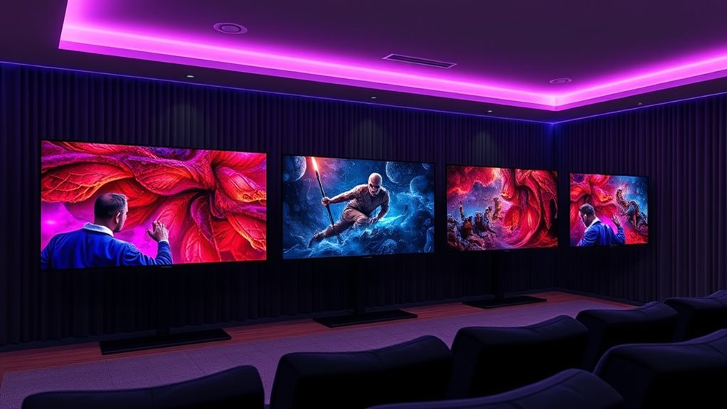 Ever wondered how your home theater’s sound quality can elevate your viewing experience? High-quality 4K QLED TVs often support Dolby Atmos, providing immersive, multidimensional sound that surrounds you. Advanced acoustic technologies like multi-directional sound and sound positioning tweeters improve clarity and create realistic surround effects. Many models incorporate AI-driven audio processing, which optimizes sound based on your room’s acoustics, guaranteeing consistent quality. Built-in speakers in premium QLED TVs can produce wide, elevated sound stages that complement their stunning visuals. For even better sound, these TVs are compatible with external sound systems and soundbars, allowing you to customize your audio experience further. Prioritizing audio performance ensures you don’t just see, but also truly hear the cinematic magic.