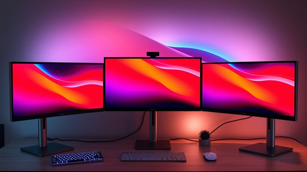 Color accuracy and gamut are essential considerations that directly influence the visual quality of a 5K monitor for your MacBook Pro. A wide color gamut like P3 guarantees vibrant, true-to-life colors ideal for professional work. A 10-bit color depth offers smooth gradations, minimizing banding and providing more detailed images. Calibration and reference modes help maintain consistent color correctness across different displays, critical for creative tasks. Keep in mind that nano-texture and standard glass options can impact glare and reflectivity, affecting how colors appear in various lighting conditions. Additionally, high contrast ratios, such as 1,000,000:1, improve color differentiation and image depth. Prioritizing these factors guarantees your monitor delivers precise, rich colors, making it perfect for editing, design, and multimedia consumption.