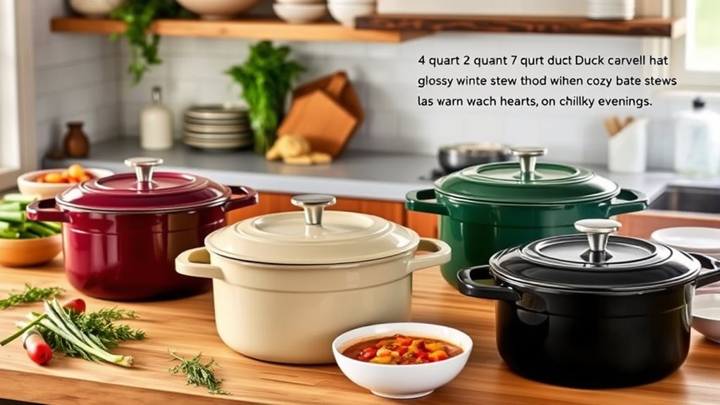 If you’re looking for the best 7-quart Dutch ovens to warm up your winter stews, I recommend options made from high-quality cast iron or enamel-coated cast iron. Look for models with thick walls for even heat retention, sturdy lids that lock in moisture, and easy-to-clean interiors. These features guarantee your dishes stay flavorful and perfectly cooked. Keep exploring, and you’ll find fantastic choices that combine durability, performance, and style to make your cozy meals unforgettable.