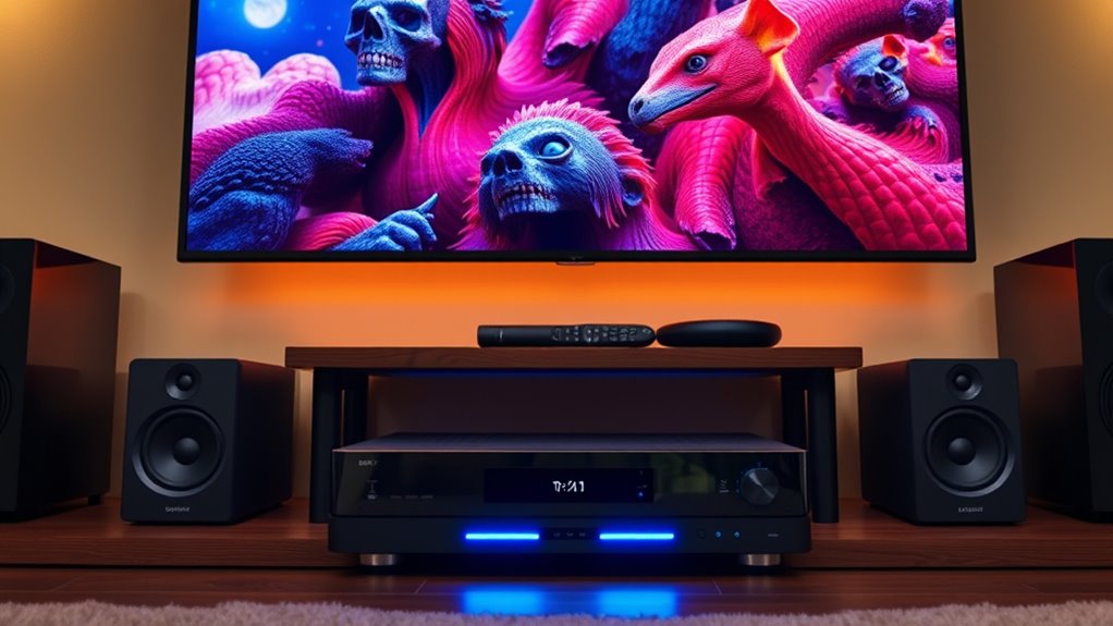 Supporting the latest video resolutions is just part of creating an immersive home theater experience; equally important is ensuring your 8K Blu-ray player delivers high-quality audio. Look for support for high-resolution audio formats like Dolby TrueHD, DTS-HD Master Audio, and Dolby Atmos, which provide rich, immersive sound. Compatibility with Hi-Res Audio formats such as DSD, FLAC, and ALAC can elevate your listening beyond standard surround sound. Make sure the player supports surround sound technologies like Dolby Digital, Dolby Digital Plus, and DTS:X for multi-channel audio playback. Additionally, verify its ability to decode advanced audio codecs used in 8K content, maintaining fidelity during playback. Seamless integration with external audio systems via HDMI eARC or optical outputs is vital for delivering premium sound quality throughout your home theater setup.