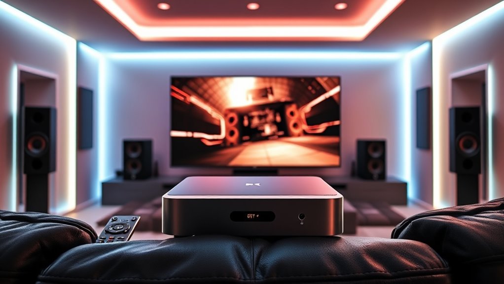 When selecting an 8K TV box, paying attention to audio and video codecs is key to revealing the full potential of your home theater. I look for devices that support popular audio codecs like Dolby Atmos, DTS:X, and Dolby Audio, which deliver immersive sound. Compatibility with advanced video codecs such as HEVC/H.265, AV1, VP9, and HDR formats ensures high-quality, high-resolution playback. I also check if the device can decode multiple codecs simultaneously, so I won’t face issues streaming diverse content. Supporting standards like HDCP 2.3 and HDMI 2.1 guarantees seamless transmission of protected content at 8K resolution. Ultimately, I consider whether the box can output high-bitrate audio and video streams, optimizing performance on my high-end home theater system.