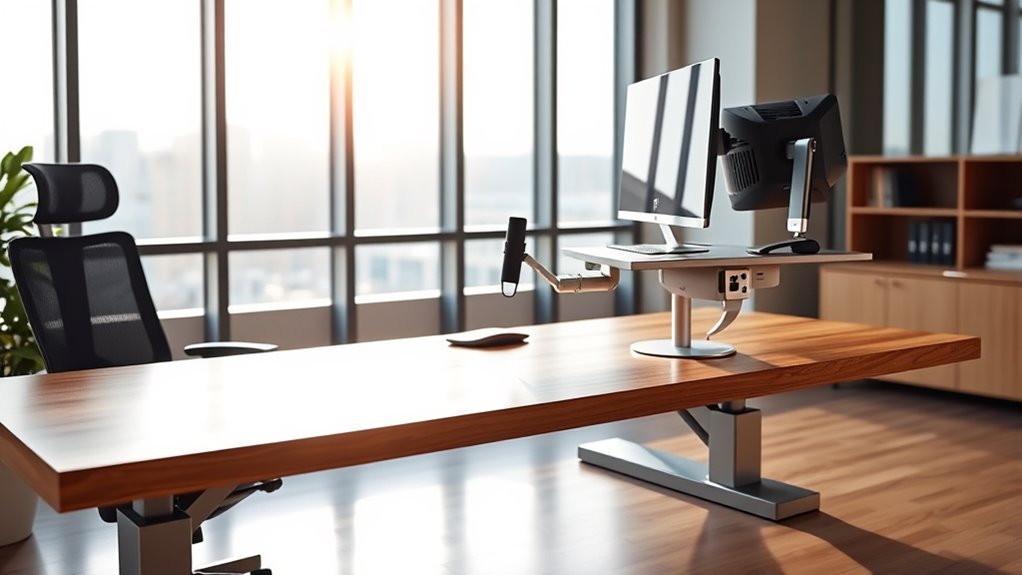 Considering additional features and accessories can considerably enhance the functionality and organization of your sit-stand desk. Cable management trays, desktop grommets, and built-in hooks help keep wires, accessories, and personal items tidy, creating a clutter-free workspace. Many desks include programmable memory presets, so you can save your preferred heights for quick adjustments. Some models feature child safety locks or collision avoidance technology, which help prevent accidental movements and protect users and equipment. Compatibility with accessories like monitor arms, keyboard trays, or charging stations can boost ergonomics and maximize your workspace. Additionally, optional mobility features such as rolling wheels or modular components allow you to adapt your desk to different layouts and needs. These features can substantially improve your overall experience and productivity.
