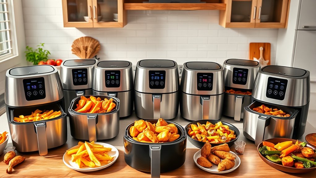 Accurate temperature control plays a vital role in guaranteeing your large family meals turn out perfectly every time. Precise adjustments help achieve consistent results and ideal food texture, especially when cooking in bulk. Look for air fryers with adjustable temperature settings in 5°F increments; this allows you to fine-tune for different recipes. Reliable temperature regulation minimizes the risk of undercooking or overcooking, keeping meals safe and flavorful. Many advanced models feature digital displays and controls, providing clear readouts and easier monitoring. For multi-rack or dual-zone units, consistent temperature control across all zones is essential for even cooking. Overall, choosing an air fryer with precise temperature control ensures every dish is cooked to perfection, saving you time and effort in the kitchen.