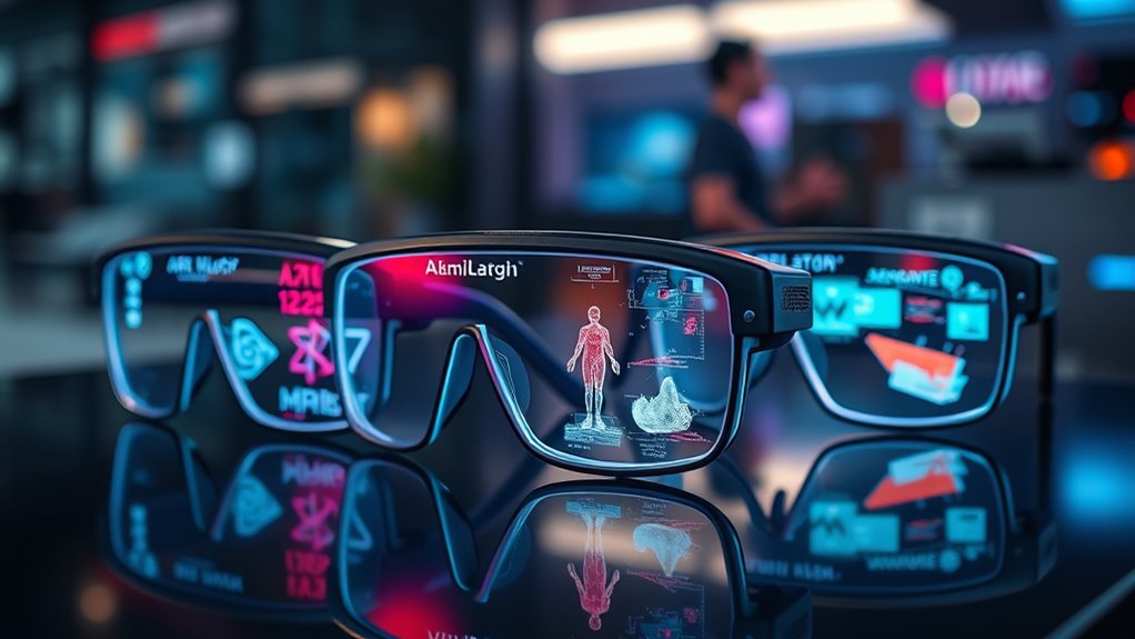 To achieve truly immersive experiences with AR glasses, display quality and clarity are essential factors to take into account. High resolution and pixel density are indispensable for sharp, realistic images, minimizing pixelation and making virtual elements seamlessly blend with the real world. A wide field of view (FOV) enhances immersion by expanding the virtual environment around your peripheral vision, creating a more natural experience. Brightness levels of 600 nits or higher ensure visibility in various lighting conditions, including outdoors. Support for high refresh rates, like 120Hz, provides smooth motion and reduces latency, which is critical during fast-paced interactions. Accurate color reproduction and high contrast ratios further improve visual vividness, helping virtual elements stand out clearly and convincingly against real-world backgrounds.
