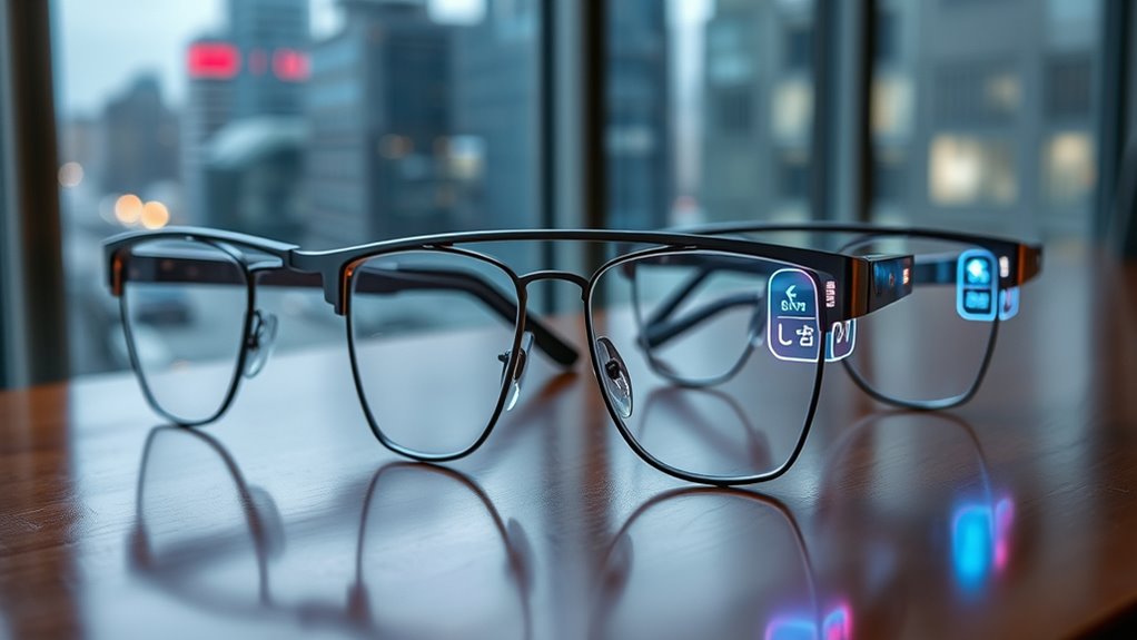 Prioritizing privacy features is essential when choosing AR translation glasses, especially if you’ll be sharing sensitive information. Look for models with advanced privacy tech like Whisper Mode, which directs audio straight to your ears and minimizes sound leakage. Consider glasses with physical privacy measures, such as high ambient light blocking—blocking up to 99.6% of external light—so your visuals stay private in bright settings. Check for certifications like TÜV SÜD, indicating compliance with standards that reduce eye strain and prevent accidental display exposure. Guarantee the glasses support secure data transmission through encryption protocols to protect your information. Finally, look for privacy controls or modes that let you swiftly switch between public and private viewing, giving you discretion when needed.