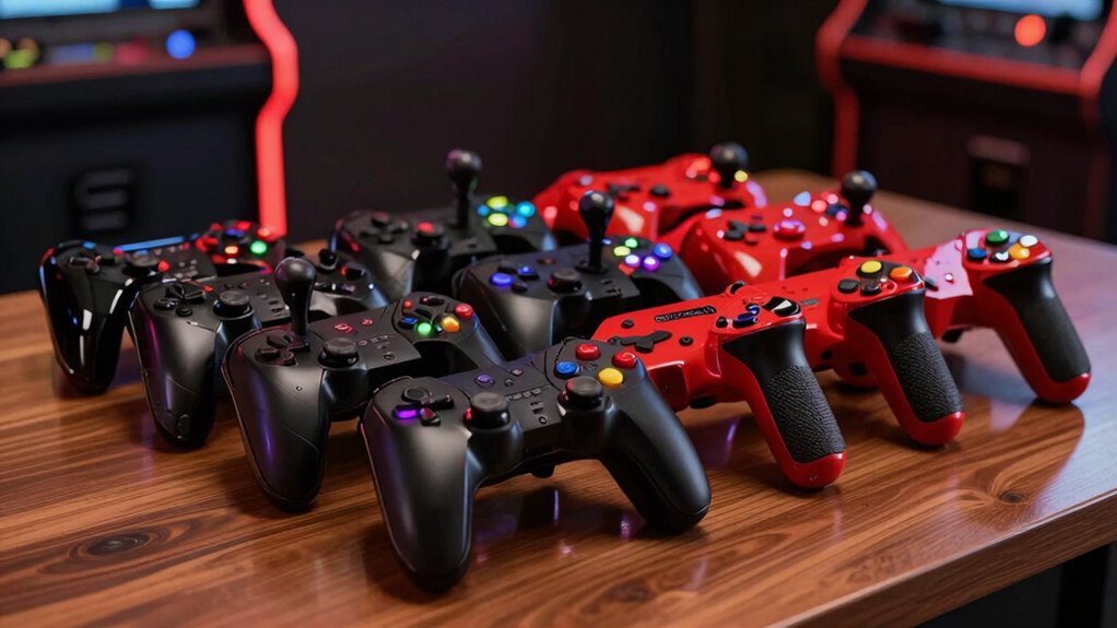 Customization options can considerably enhance your arcade fight stick experience by allowing you to tailor it to your play style. Many sticks let you swap out buttons and joysticks, so you can upgrade for better responsiveness or durability. Some models include software or hardware profiles, making it easy to save and switch between different configurations. Open chassis designs and removable faceplates simplify customizing artwork, button layouts, and internal components without hassle. Compatibility with high-quality parts like Sanwa Denshi or HAYABUSA ensures durability and precise control, and many sticks support upgrades to these components. Plus, accessories like restrictor gates, custom artwork, and programmable macros expand personalization options, letting you craft a truly unique and optimized gaming experience tailored specifically to your preferences.