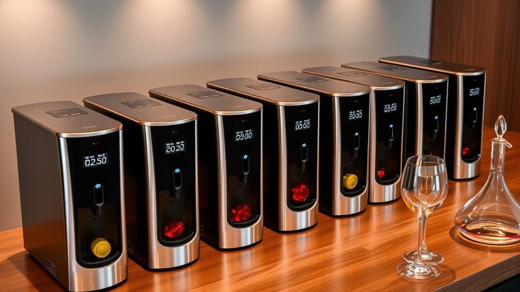 If you’re looking to enhance your home bar, I recommend exploring the top automatic wine dispensers. These sleek devices combine style, precision, and convenience, making pouring, aerating, and preserving wine effortless. Many models are USB rechargeable, include helpful accessories, and have touch controls for quick operations. Whether you want a compact design or a multi-function set, there’s an option for you. Keep going to discover the best choices to elevate your wine experience.