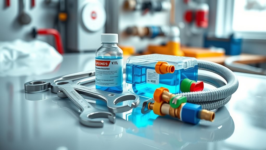 Choosing a boiler descaler kit that fits your system is essential for effective winter maintenance. First, confirm the kit is compatible with your boiler model and connection sizes, like ¾-inch or ½-inch fittings, to guarantee a secure fit. Check that the descaler solution is suitable for your boiler’s materials—whether stainless steel, copper, or others—to prevent corrosion or damage. The kit should include hoses and fittings that connect easily to your inlet and outlet valves without requiring modifications. Also, verify that the descaler solution is approved for your boiler type and meets safety standards, safeguarding your warranty. Finally, consider whether the kit’s design works with your boiler’s configuration—vertical or horizontal—for thorough, efficient descaling. Proper compatibility ensures peak performance and protection.