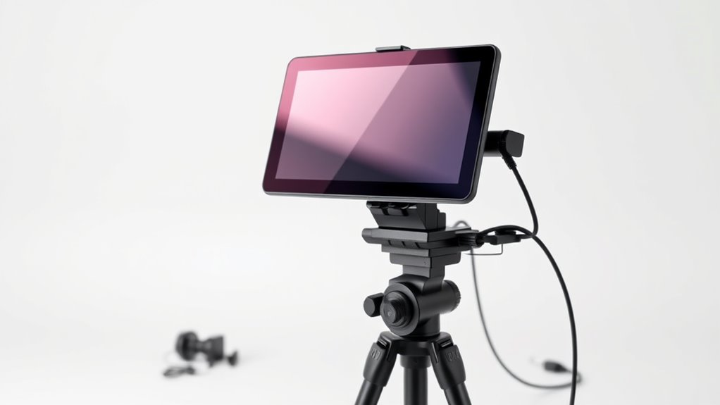 When selecting a budget teleprompter, build durability plays a key role in ensuring long-term performance. I look for models made from lightweight aluminum alloys or sturdy plastics that strike a good balance between portability and strength. The quality of the beamsplitter glass matters too; durable glass resists scratches and damage, extending its lifespan. Reinforced joints and secure locking mechanisms are vital, as they withstand frequent setup and transport without compromising stability. Compatibility with standard tripods and mounting accessories also enhances durability by reducing accidental falls or damage. Regular maintenance, like cleaning the glass and inspecting mounting points, further prolongs the life of the teleprompter. Focusing on these factors helps me choose a reliable, long-lasting device that withstands everyday use.