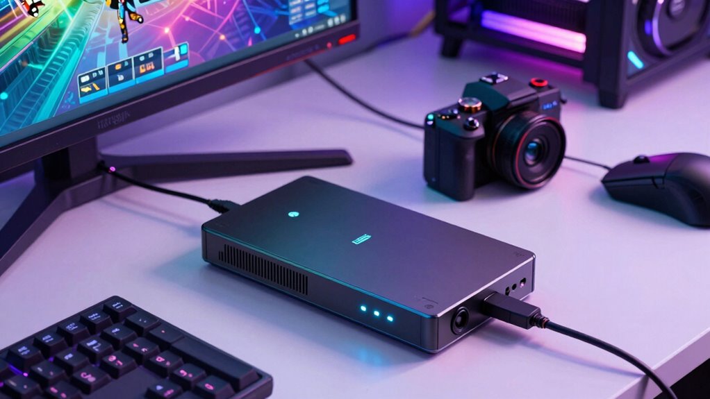 When choosing a capture card for my console, I consider how well it functions with my devices and whether it supports the right resolution and frame rate. I also look at how easy it is to set up, the latency involved, and the available ports for connections. These factors help guarantee I get a smooth, hassle-free recording or streaming experience.