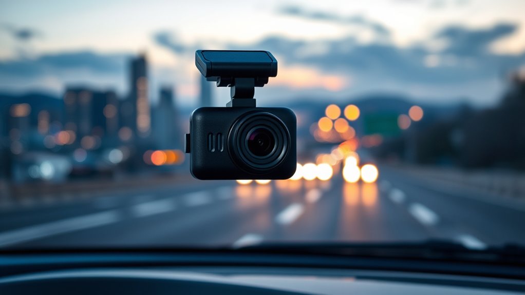 When selecting a dash cam, I look at video resolution to guarantee clear footage, especially in emergencies. Night vision features are also vital for capturing details in low-light conditions, while ample storage and loop recording keep footage safe and accessible. Additionally, connectivity options, GPS, and route tracking add valuable features that enhance the device’s overall usefulness.