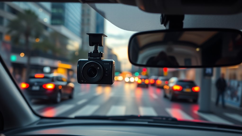 When selecting a dash camera, prioritizing advanced safety features can make a significant difference in protecting you and your vehicle. G-sensors automatically lock footage during collisions, ensuring essential evidence isn’t overwritten. Parking mode, especially when paired with hardwire kits, offers around-the-clock surveillance, capturing incidents even when parked. Night vision technology with infrared or wide dynamic range (WDR) enhances low-light recording, helping identify license plates and details in darkness. Some models include GPS and real-time speed tracking, which can aid in accident reconstruction and legal cases. Additionally, impact detection alerts notify you of sudden shocks, while lane departure warnings help prevent accidents by alerting you if you drift out of your lane. These features collectively boost your safety and peace of mind on the road.