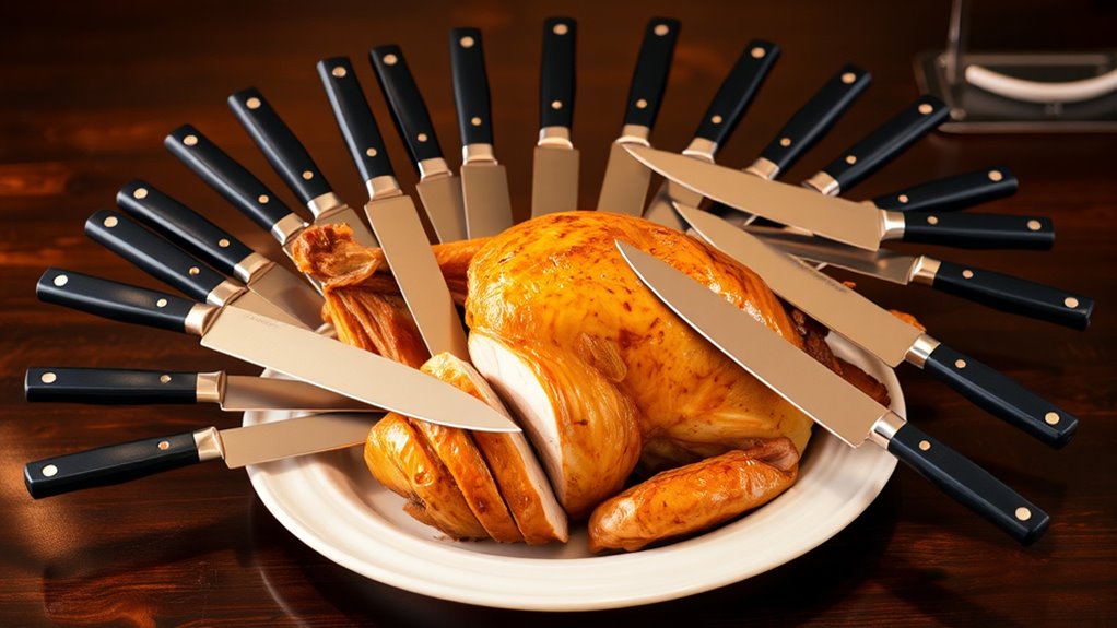 Choosing the perfect carving knife set is like finding the key to a smooth holiday feast. With options from razor-sharp German steel to ergonomic handles, you’re equipped to carve with confidence and style. Remember, the right set makes all the difference—turning a simple turkey into a masterpiece on your table. So, pick your perfect match and get ready to serve up memories as warm as the holiday season itself.