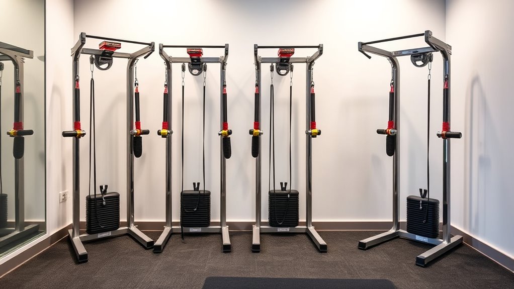 Choosing a compact home-gym cable machine requires careful attention to space efficiency, especially since many models only need 3 to 5 square feet of room. Wall-mounted designs are excellent because they eliminate floor space, making them perfect for small rooms or corners. Adjustable pulley systems with multiple height settings help maximize exercise options without adding to the footprint. Foldable or collapsible models are ideal if you want to store the machine away when not in use, saving even more space. Additionally, machines with integrated attachments and multiple exercise options reduce the need for extra equipment, keeping your setup streamlined. Prioritizing these features guarantees your space is used efficiently while still providing a versatile, effective workout.