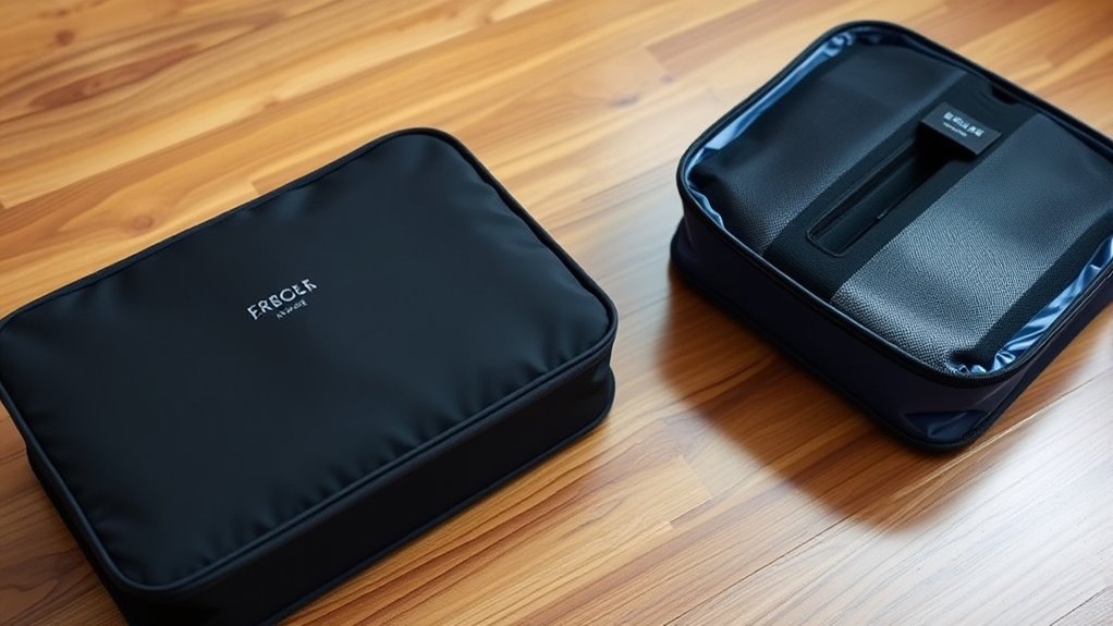 Selecting durable compression packing cubes hinges on the materials they’re made from, as these determine how well they withstand the rigors of travel. High-denier nylon or polyester fabrics are ideal because they resist tears and abrasions, keeping your belongings protected. Water-resistant or water-repellent fabrics add extra protection against moisture, spills, and humidity, prolonging the cubes’ lifespan. Reinforced seams and double-stitched edges further boost durability, preventing fraying after multiple uses. The material choice also impacts how well the cubes handle frequent compression and decompression without losing their shape or integrity. Investing in high-quality fabrics ensures that the cubes maintain their structure and compression power over time, making them a reliable companion for your trips. Durability is essential for long-lasting performance and value.