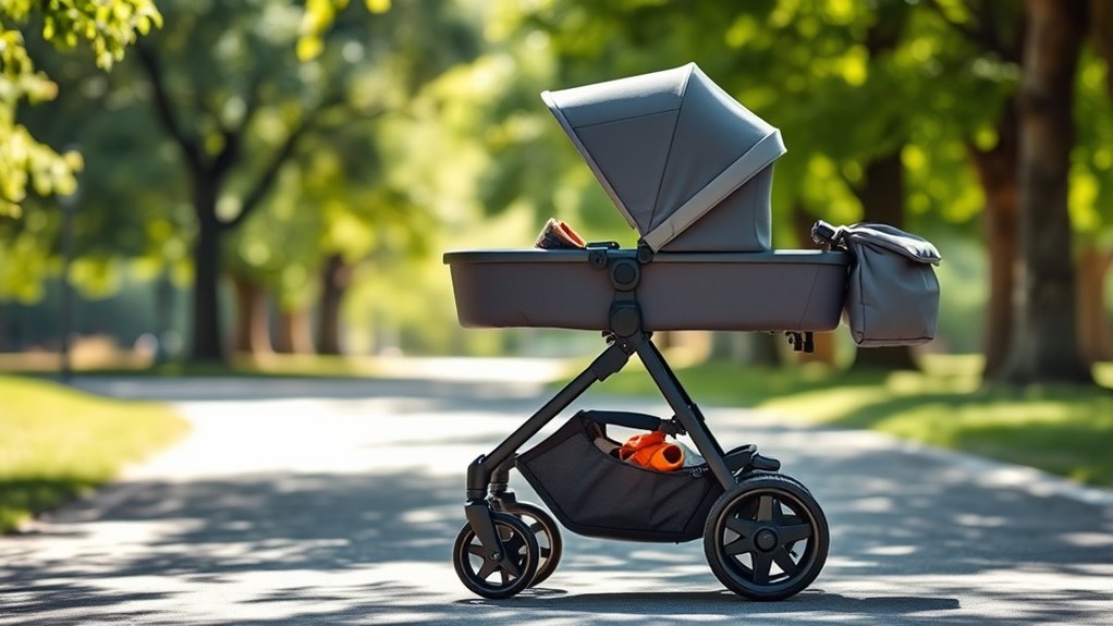 Choosing a convertible stroller travel system that’s easy to change can make outings much more manageable. I look for systems that switch modes quickly and effortlessly, ideally within seconds, so I don’t waste time or disturb my child. Features like one-click mechanisms or simple fold-and-unfold designs are game-changers, eliminating the need for complicated steps or tools. It’s important that the shift doesn’t compromise my child’s safety or comfort—no removing or disturbing them during the process. I also pay attention to the stability and security of the system during transformation to prevent accidental collapses. Ergonomic handles and clearly marked adjustment points help ensure the conversion is smooth and safe. Ultimately, an intuitive, straightforward process makes it easier to adapt the stroller to changing needs on the go.