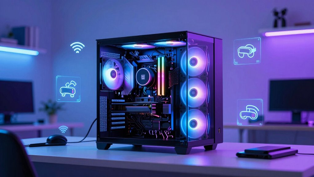 When selecting a CPU for wireless PCVR streaming, it’s essential to guarantee it supports high data transfer speeds and has enough PCIe lanes to handle VR headset connections and data streams smoothly. Compatibility with your motherboard’s VR-Ready features also plays a pivotal role in delivering a seamless experience, as they ensure the system can optimize VR-specific tasks efficiently. Additionally, choosing a CPU with integrated graphics, like AMD Ryzen G-series processors, can help reduce latency and improve streaming performance when paired with compatible VR headsets. Sufficient core and thread counts are indispensable for managing real-time data processing and rendering demands. Lastly, support for the latest USB standards and fast I/O options in the CPU architecture ensures stable wireless connections and minimal lag during your VR sessions.