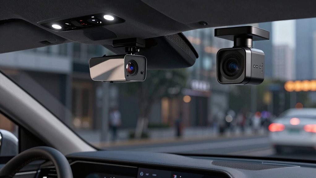 When choosing dash cams for both the front and rear, I consider several key factors to guarantee I get the best protection. Video quality, especially at night, is vital, along with enough storage capacity for all recordings. Connectivity options and parking mode features also play a big role in making certain my vehicle stays secure around the clock.