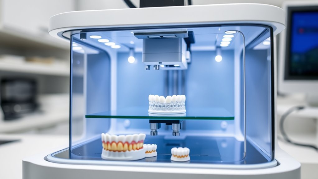 Have you considered how vital material compatibility is when selecting a dental 3D printer? It’s essential because different procedures require specific resins, like those for temporary crowns, surgical guides, or orthodontic models. A versatile printer supports a wide range of resins, which depends on factors like wavelength (e.g., 405nm for resin printers) and technology type (DLP, LCD, SLA). Compatibility with various brands and formulations ensures proper curing and adhesion, avoiding failures during printing. Some printers even support dual-material printing or specialty resins, such as biocompatible or flexible options, offering greater flexibility for patient-specific needs. Prioritizing material compatibility helps streamline workflows, reduces costs, and allows you to adapt quickly to different clinical applications.