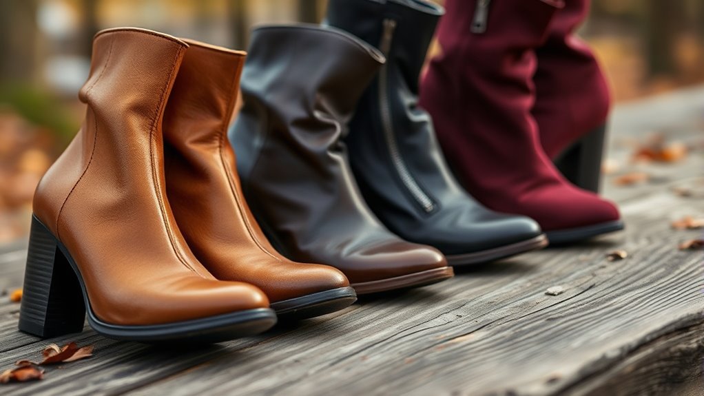 When choosing ankle boots for fall weather, I consider the material and the weather forecast. For rainy days, I pick waterproof leather or suede with a sturdy sole. On chilly days, I opt for boots with insulation or thicker lining. If it’s warm, I go for lighter, breathable fabrics. I also check the heel height and grip to guarantee comfort and safety across different conditions.
