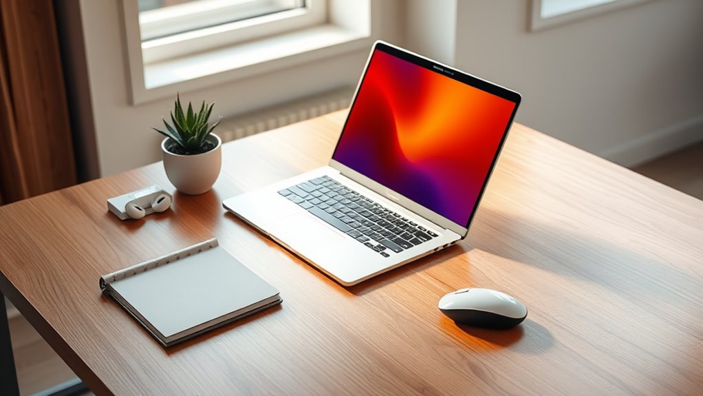 A flexible port selection is essential for creating a seamless and efficient desk replacement setup. Having a variety of ports like USB-C, HDMI, SD card readers, and Ethernet guarantees you can connect all your peripherals without hassle. Multiple USB ports, both Type-A and Type-C, allow for simultaneous connection of external drives, keyboards, and mice, reducing clutter and improving workflow. Support for external displays via HDMI or DisplayPort lets you expand your workspace with multiple monitors, boosting productivity. Audio jacks and card readers add extra functionality, often eliminating the need for external adapters. Overall, a wide range of ports guarantees compatibility with your existing devices and minimizes the need for dongles, making your setup smoother and more adaptable to diverse work scenarios.