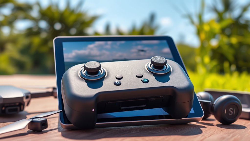 Choosing a drone controller that fits your tablet is essential for a smooth flying experience. I always check that the controller supports tablet sizes from at least 4.7 to 12.9 inches, ensuring compatibility with my device. It’s important to verify that the controller works with my specific drone model, like the Mavic or Mini series, for seamless connectivity. I also pay attention to the mounting mechanism, making sure it can securely hold my tablet’s width and thickness, especially with cases. Additionally, I confirm the controller supports my tablet’s operating system and connection type, whether USB-C or Micro USB, to ensure smooth data transfer. Ultimately, I consider the holder’s weight capacity so my tablet stays stable during flight.