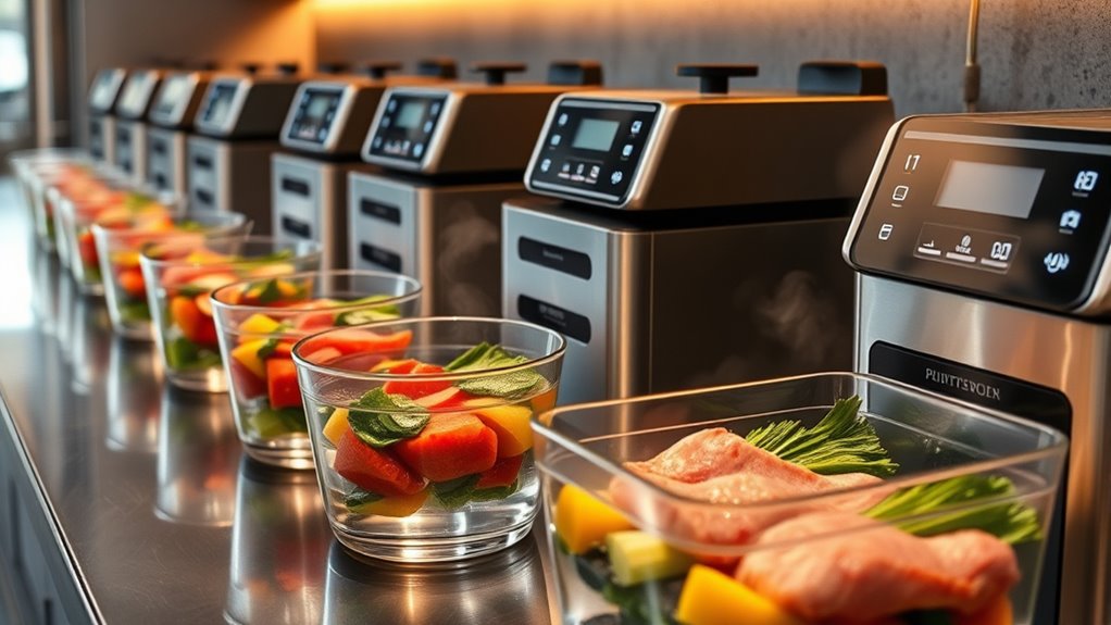 Imagine two streams flowing side by side in a clear mountain creek, never mixing but sharing the same bed. That’s how dual-zone sous-vide units manage water circulation—they use separate circulation pumps and insulated chambers to keep flavors distinct. Each zone’s water moves independently, ensuring no crossover. I’ve seen this in action, and it’s impressive how technology keeps flavors pure while maintaining perfect temperatures for different dishes.