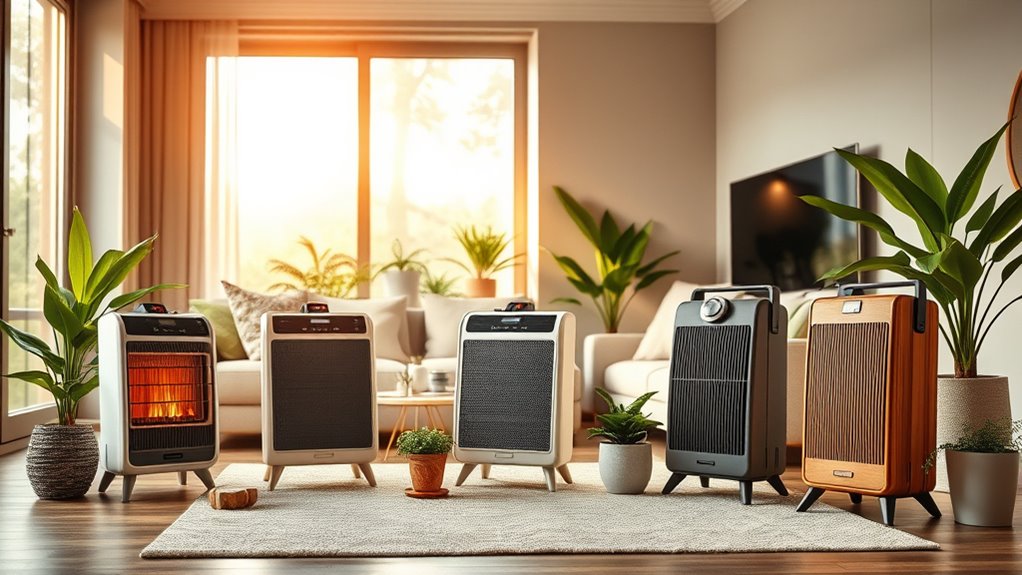 If you’re looking for the best eco-friendly space heaters, I recommend models that use ceramic or graphene heating, smart controls, and safety features to save energy and money. These heaters offer quick, even heat with adjustable thermostats, multiple modes, and safety protections like overheat shutoff and tip-over protection. They’re compact, portable, and perfect for small to medium spaces, helping you stay warm efficiently. Keep exploring to discover the top options that combine comfort, safety, and savings.