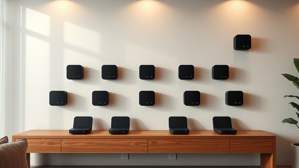 Setting up an Eero Wi-Fi mesh system is designed to be quick and straightforward, making it accessible even if you’re not tech-savvy. Using the dedicated Eero app, I found the entire process took just minutes. The app provides clear, step-by-step guidance, including ideal placement suggestions and network configuration tips to guarantee the best coverage. Many Eero systems support automatic updates and network optimization features that activate seamlessly after setup, so I don’t have to worry about manual adjustments. Adding extenders or extra nodes is just as simple—done effortlessly through the app with no complicated wiring or technical knowledge needed. The plug-and-play design keeps things simple, making Eero systems a smart choice for anyone seeking a hassle-free setup experience.