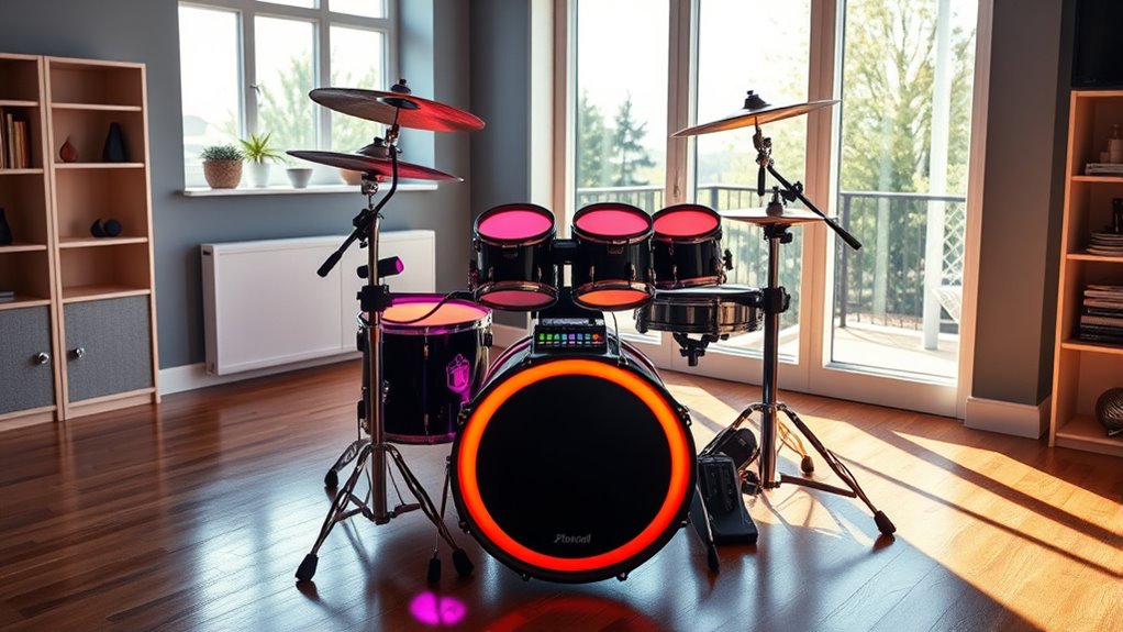 Choosing an electric drum set with excellent sound quality and a wide variety of tones is essential for a versatile and realistic playing experience. High-quality models offer over 400 sound samples and multiple drum kits, giving you plenty of options for different genres and styles. The variety includes percussion effects, customizable tones, and demo songs, which boost creativity and practice flexibility. Advanced sets support MIDI compatibility, allowing integration with music production software and access to digital sounds beyond the onboard options. Sound quality is also influenced by stereo speakers and bass effects, making the experience more immersive and lifelike. A diverse sound palette guarantees you’ll find the perfect tone for any musical project, making your setup both dynamic and inspiring.