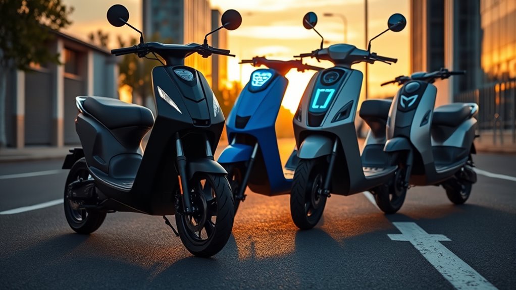 Imagine riding a leaf carried gently by the wind—that’s how eco-friendly electric scooters feel. Many brands now prioritize sustainability, using recycled materials and energy-efficient manufacturing. I’ve seen models with biodegradable parts and solar charging options, making them a greener choice. These scooters help reduce carbon footprints, turning urban commutes into environmentally conscious journeys. If you’re looking to ride sustainably, I recommend exploring options that emphasize eco-friendly design and materials.
