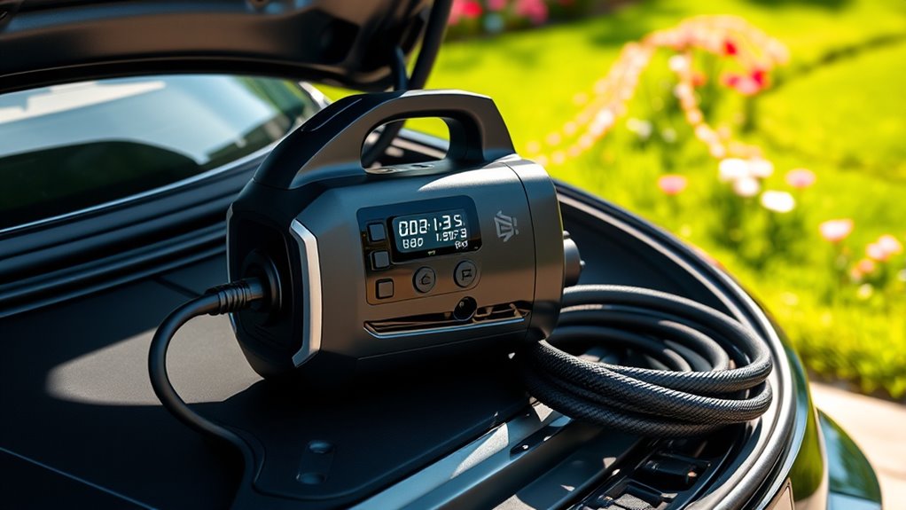 Choosing the right power source for your electric vehicle tire pump is crucial to guarantee compatibility and reliable performance. You need to verify the pump’s power outlet matches your vehicle’s, whether it’s a 12V DC cigarette lighter or AC power. Some models support dual power options, allowing use both on the road and at home, which adds versatility. It’s also important to check the voltage and wattage ratings to avoid overloading your vehicle’s electrical system or the outlet. Additionally, examine if the pump has a long enough power cord to reach all tires comfortably without repositioning the vehicle. For added convenience, consider a pump with a rechargeable battery, making it cordless and portable for emergencies or outdoor use.