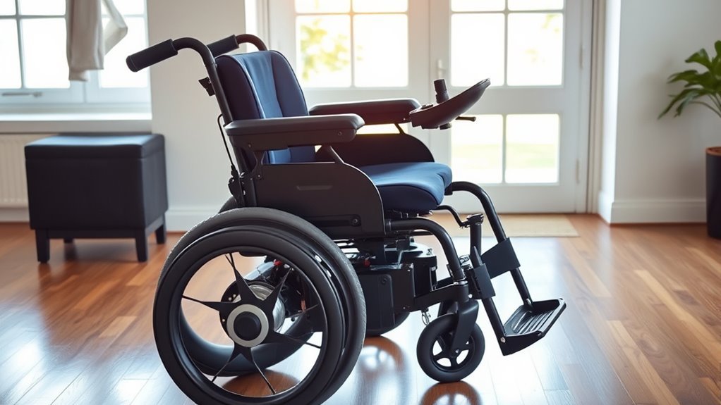 Safety features are essential to guarantee I can rely on my electric wheelchair in various situations. I look for models with electronic or electromagnetic braking systems for quick, dependable stops, especially in emergencies. Anti-tip wheels are crucial to prevent tipping on slopes or uneven ground, giving me peace of mind. Safety belts or harnesses keep me secure during movement, particularly on bumpy surfaces or inclines. Responsive safety alerts like emergency stop buttons or alarms are vital for immediate control if needed. Additionally, reinforced frames and shock-absorbing tires enhance stability, ensuring safe navigation across different terrains. These features collectively provide confidence and security, making my wheelchair not just a mobility aid but a safe, reliable companion in daily life.