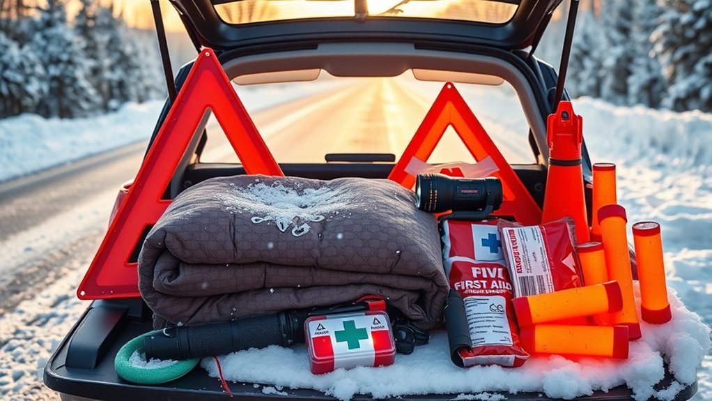 When preparing for winter snow travel, I recommend investing in a reliable emergency kit that includes jumper cables, an air compressor, and a sturdy snow shovel, along with ice scrapers and traction mats. These tools can help you quickly fix minor issues and get back on the road safely. I’ve found that the best kits also offer safety gear like reflective vests and blankets. Keep these essentials close—you’ll find out more about top options if you stay with me.